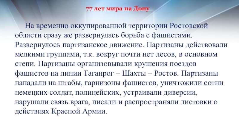 развернулась борьба с фашистами. Развернулось партизанское движение. Партизаны действовали мелкими группами, т.к. вокруг почти нет лесов, в основном степи. Партизаны организовывали крушения поездов фашистов на линии Таганрог – Шахты – Ростов. Партизаны нападали на штабы, гарнизоны фашистов, уничтожили сотни немецких солдат, полицейских, устраивали диверсии, нарушали связь врага, писали и распространяли листовки о действиях Красной Армии.