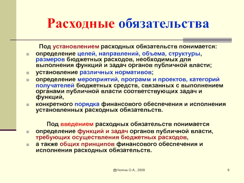 8. Расходование средств. Указывается, какой уровень публичной власти и на основании какого документа (реквизиты документа, статья пункт, абзац) осуществляет предоставление бюджетных средств на исполнение расходного обязательства.