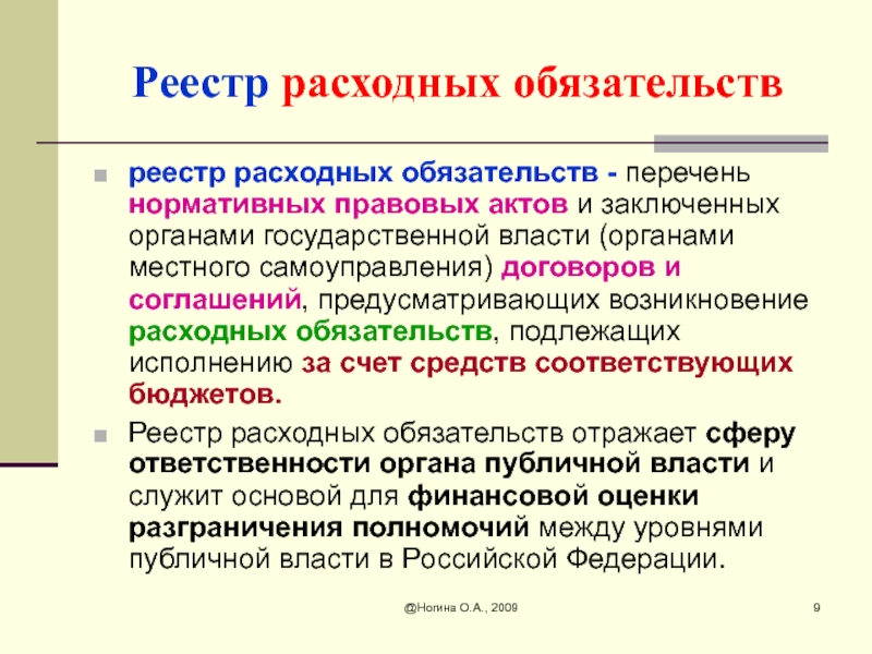 Реестр расходных обязательств отражает сферу ответственности органа публичной власти и служит основой для финансовой оценки разграничения полномочий между уровнями публичной власти в Российской Федерации.