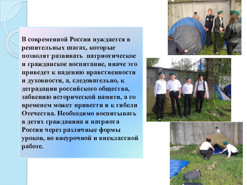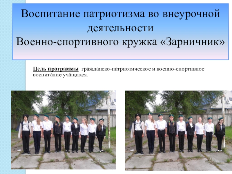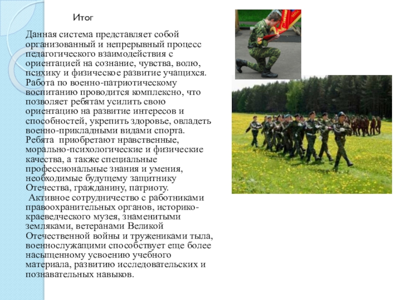учащихся. Работа по военно-патриотическому воспитанию проводится комплексно, что позволяет ребятам усилить свою ориентацию на развитие интересов и способностей, укрепить здоровье, овладеть военно-прикладными видами спорта. Ребята приобретают нравственные, морально-психологические и физические качества, а также специальные профессиональные знания и умения, необходимые будущему защитнику Отечества, гражданину, патриоту.