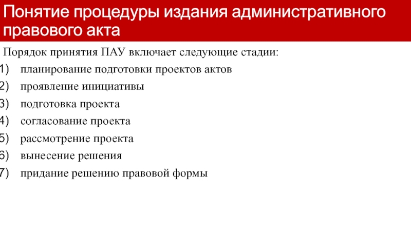 Слайд 7Понятие процедуры издания административного правового акта