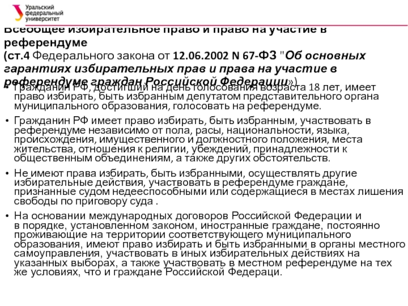 Гражданин РФ имеет право избирать, быть избранным, участвовать в референдуме независимо от пола, расы, национальности, языка, происхождения, имущественного и должностного положения, места жительства, отношения к религии, убеждений, принадлежности к общественным объединениям, а также других обстоятельств.