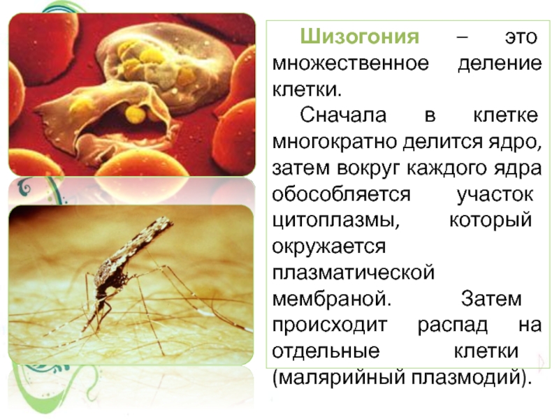 Шизогония – это множественное деление клетки. 	Сначала в клетке многократно делится ядро, затем вокруг каждого ядра обособляется