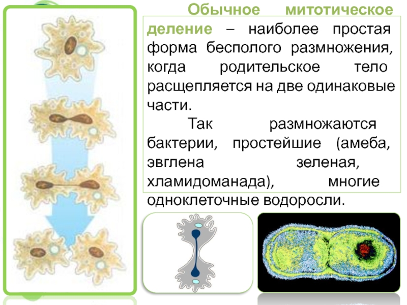 Слайд 6 Обычное митотическое деление – наиболее простая форма бесполого размножения, когда