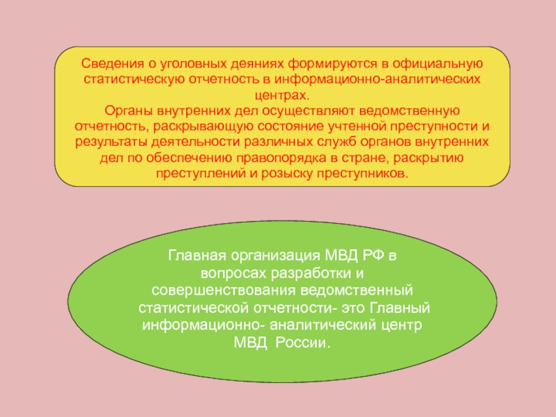 Сведения о уголовных деяниях формируются в официальную статистическую отчетность в информационно-аналитических центрах.Органы внутренних дел осуществляют ведомственную отчетность,