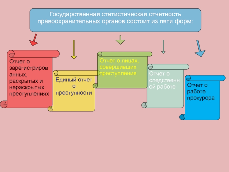 Государственная статистическая отчетность правоохранительных органов состоит из пяти форм:Отчет о зарегистрированных, раскрытых и нераскрытых преступленияхЕдиный отчет о
