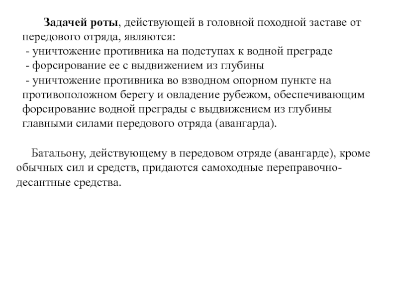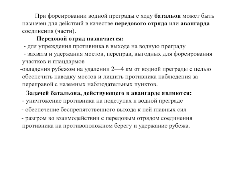 Задачей батальона, действующего в авангарде являются: - уничтожение противника на подступах к водной преграде