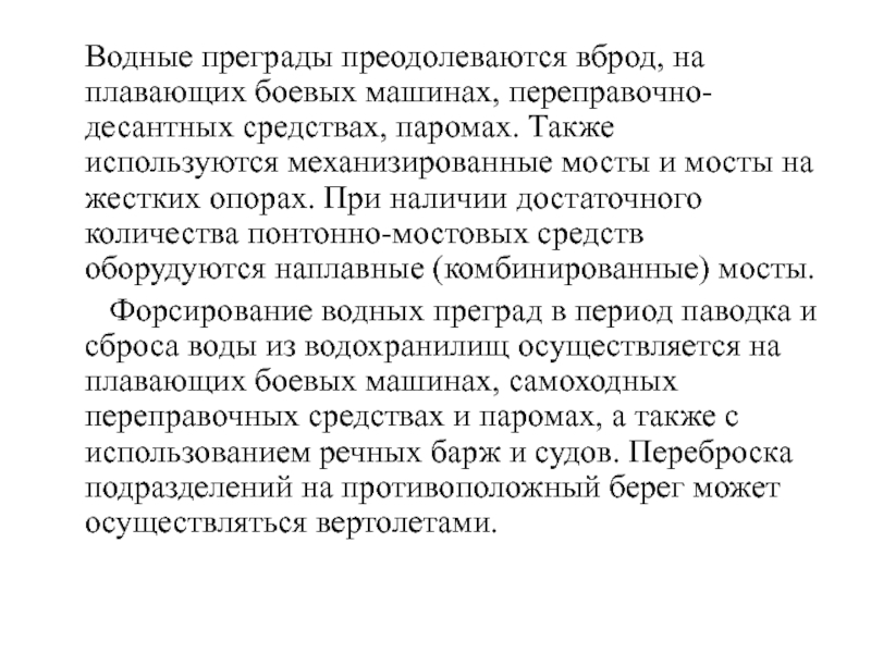 Форсирование водных преград в период паводка и сброса воды из водохранилищ осуществляется на плавающих боевых машинах, самоходных переправочных средствах и паромах, а также с использованием речных барж и судов. Переброска подразделений на противоположный берег может осуществляться вертолетами.