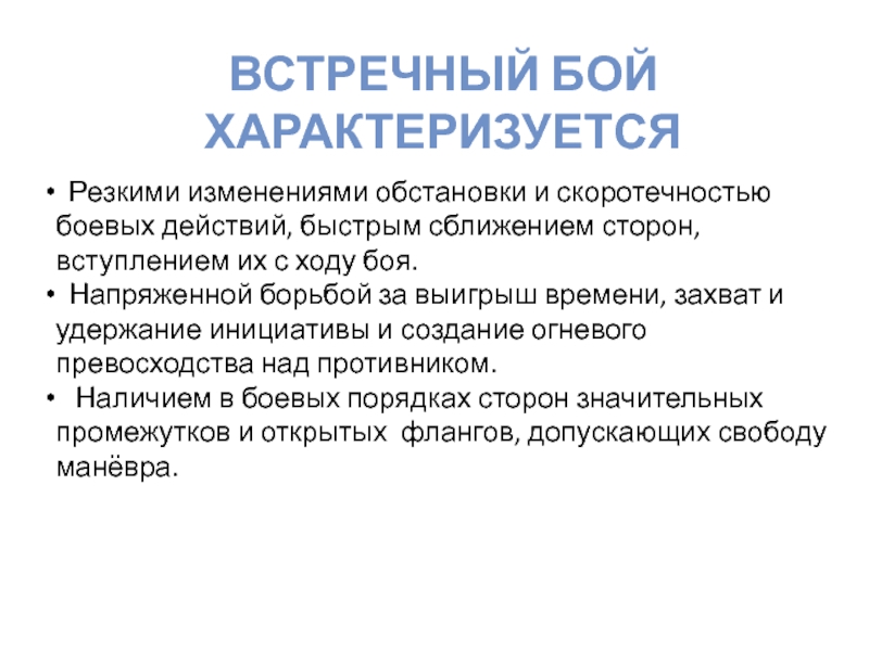Слайд 18ВСТРЕЧНЫЙ БОЙ ХАРАКТЕРИЗУЕТСЯ