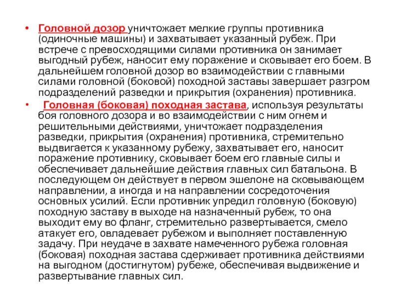 выгодный рубеж, наносит ему поражение и сковывает его боем. В дальнейшем головной дозор во взаимодействии с главными силами головной (боковой) походной заставы завершает разгром подразделений разведки и прикрытия (охранения) противника.