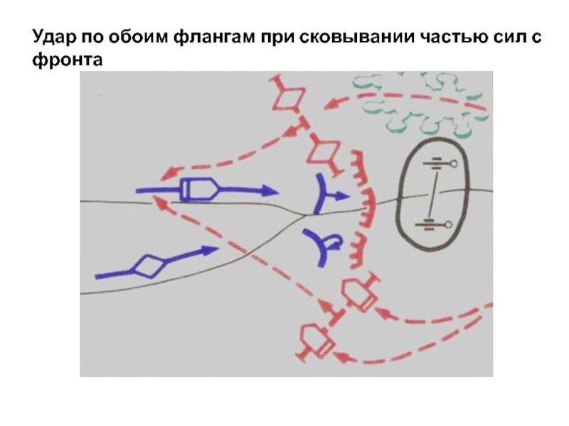 Слайд 22Удар по обоим флангам при сковывании частью сил с фронта