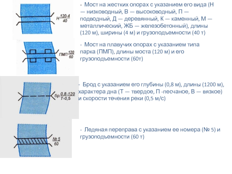 - Брод с указанием его глубины (0,8 м), длины (1200 м), характера дна (Т — твердое, П -песчаное, В — вязкое) и скорости течения реки (0,5 м/с)