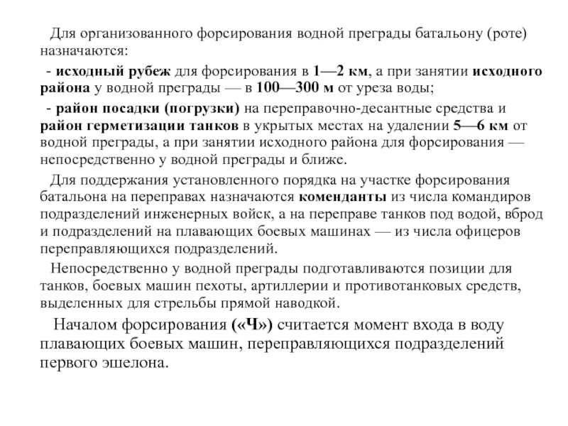 Началом форсирования («Ч») считается момент входа в воду плавающих боевых машин, переправляющихся подразделений первого эшелона.