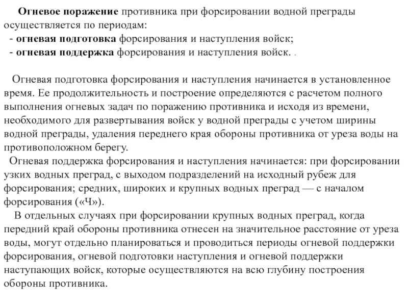 Огневая поддержка форсирования и наступления начинается: при форсировании узких водных преград, с выходом подразделений на исходный рубеж для форсирования; средних, широких и крупных водных преград — с началом форсирования («Ч»).