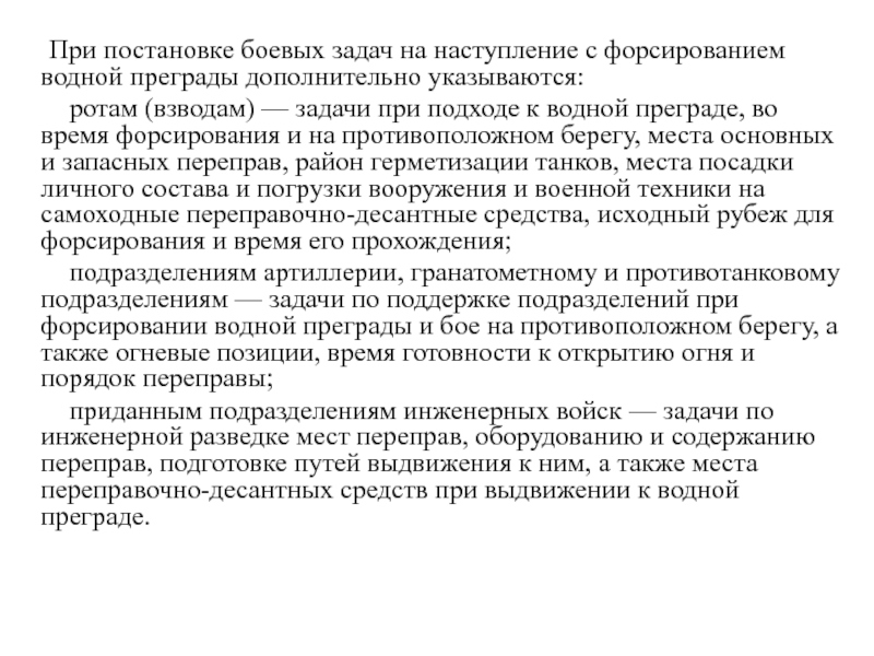 (взводам) — задачи при подходе к водной преграде, во время форсирования и на противоположном берегу, места основных и запасных переправ, район герметизации танков, места посадки личного состава и погрузки вооружения и военной техники на самоходные переправочно-десантные средства, исходный рубеж для форсирования и время его прохождения;
