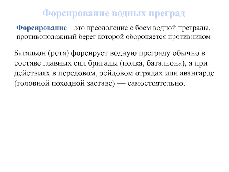 Водная преграда форсируется, как правило, с ходу с подготовкой форсирования еще до подхода подразделений к ней. В этих условиях форсирование осуществляется в том боевом порядке, в котором батальон (рота) ведет наступление.