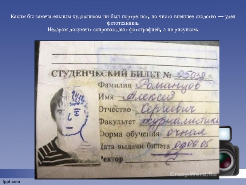 Слайд 17Фотоаппарат — средство, подобное карандашу или кисти. Никакая фотография не