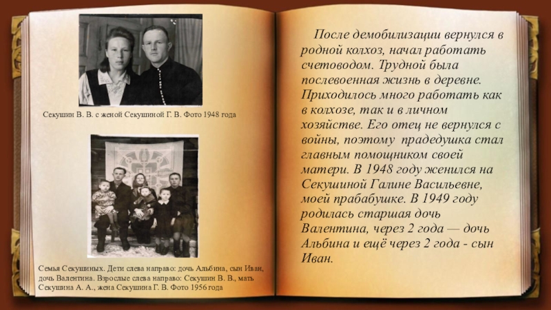 Семья Секушиных. Дети слева направо: дочь Альбина, сын Иван, дочь Валентина. Взрослые слева направо: Секушин В. В., мать Секушина А. А., жена Секушина Г. В. Фото 1956 года