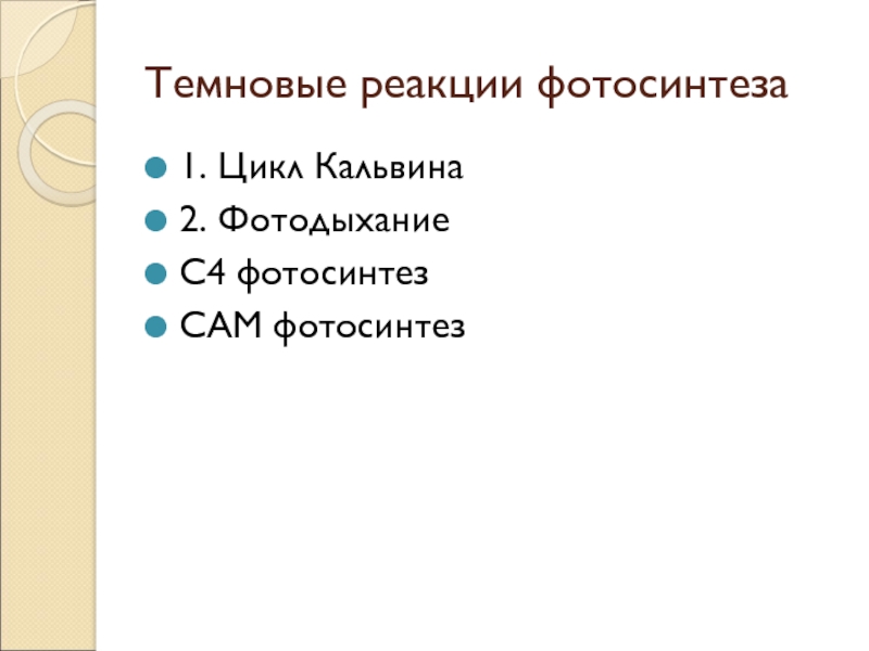 Темновые реакции фотосинтеза1. Цикл Кальвина2. ФотодыханиеС4 фотосинтезCAM фотосинтез