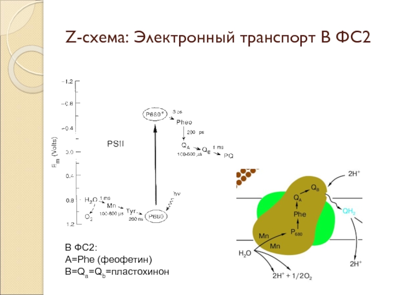 Z-схема: Электронный транспорт В ФС2В ФС2:A=Phe (феофетин)B=Qa=Qb=пластохинон