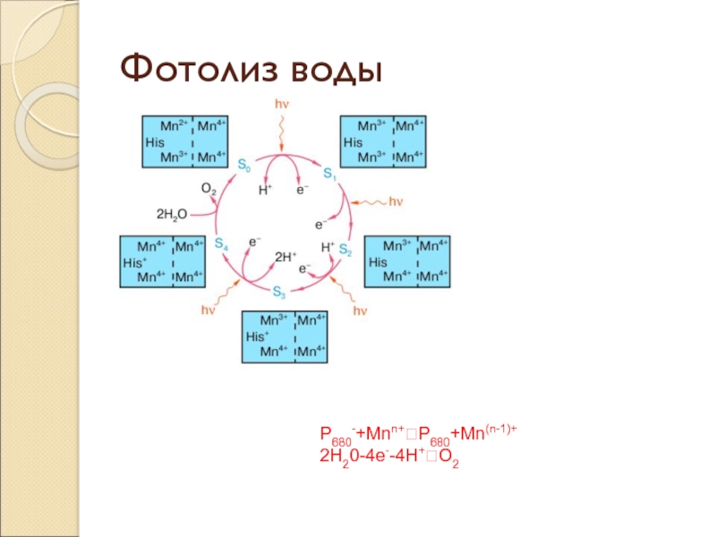 Фотолиз водыP680-+Mnn+P680+Mn(n-1)+2H20-4e--4H+O2