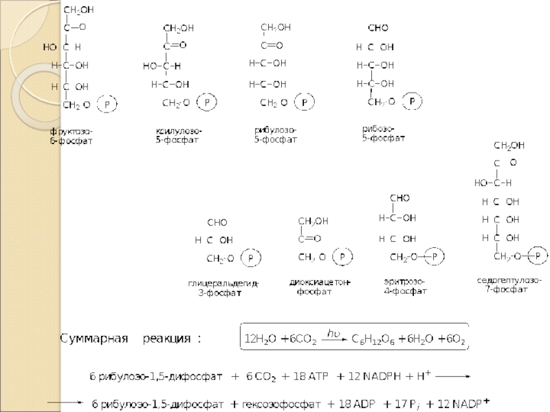 Суммарное уравнение, общий вид12H20+6CO2C6H12O6+6H2O+6O2Но возможны и варианты, например у серных бактерий:2H2S+CO2(CH2O)+H2O+2SВ общем виде:2H2A+CO2(CH2O)+H2O+2AТ.е. происходит разложение воды, а