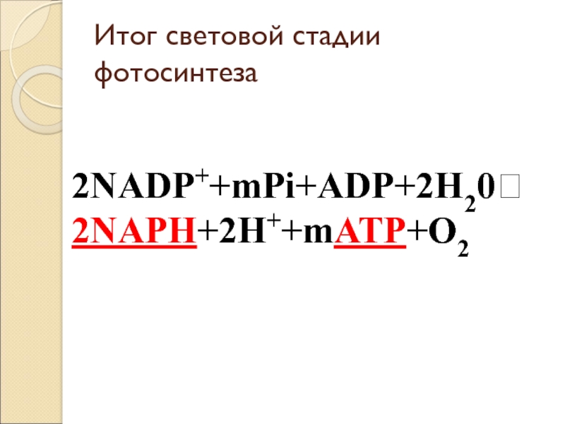 Итог световой стадии фотосинтеза2NADP++mPi+ADP+2H20 2NAPH+2H++mATP+O2
