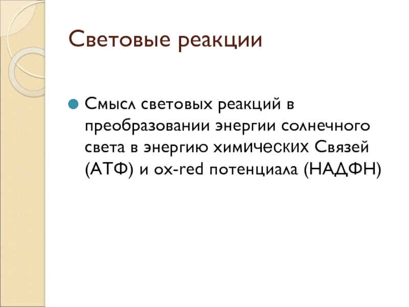 Световые реакцииСмысл световых реакций в преобразовании энергии солнечного света в энергию химических Связей (АТФ) и ox-red потенциала