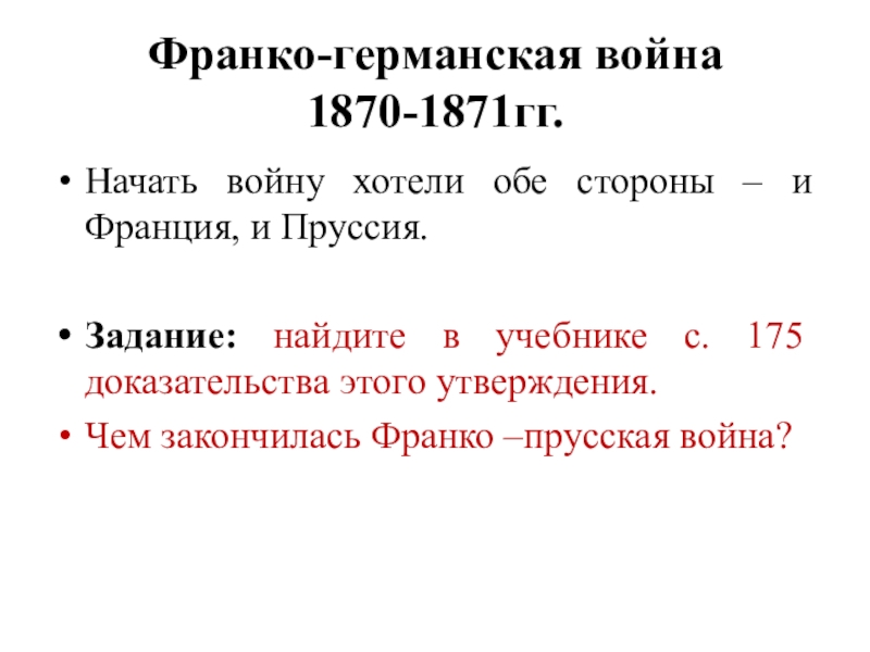 Франко-германская война 1870-1871гг.Начать войну хотели обе стороны – и Франция, и Пруссия.Задание: найдите в учебнике с. 175
