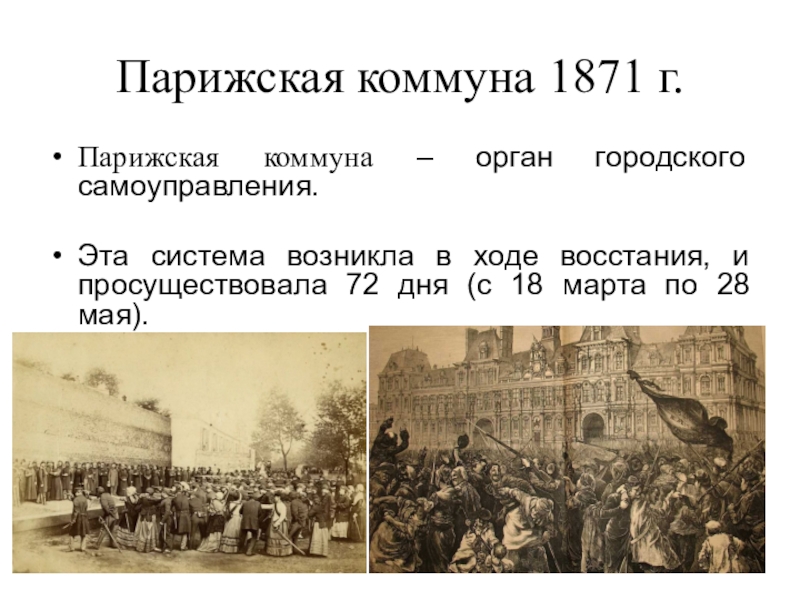 Парижская коммуна 1871 г.Парижская коммуна – орган городского самоуправления.Эта система возникла в ходе восстания, и просуществовала 72