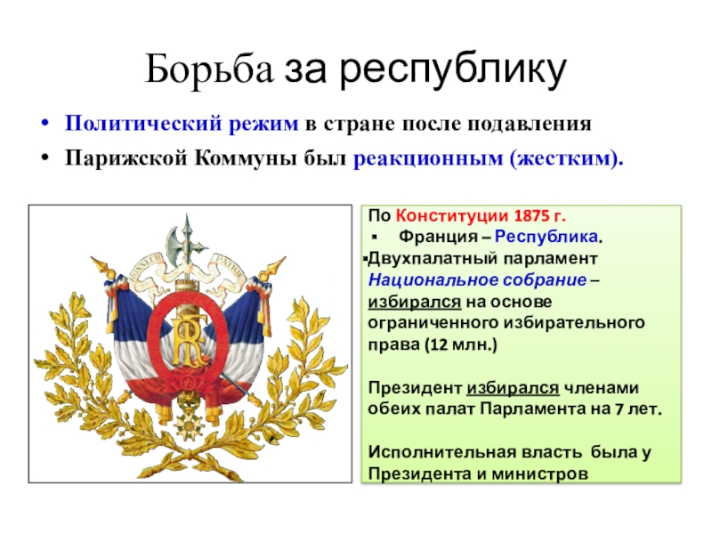 Борьба за республикуПолитический режим в стране после подавления Парижской Коммуны был реакционным (жестким). По Конституции 1875 г.