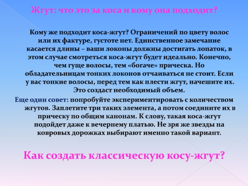 Слайд 4Жгут: что это за коса и кому она подходит? Начнем с