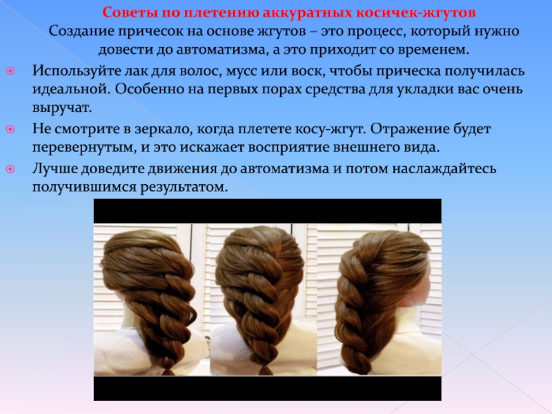 Слайд 9 Советы по плетению аккуратных косичек-жгутов Создание