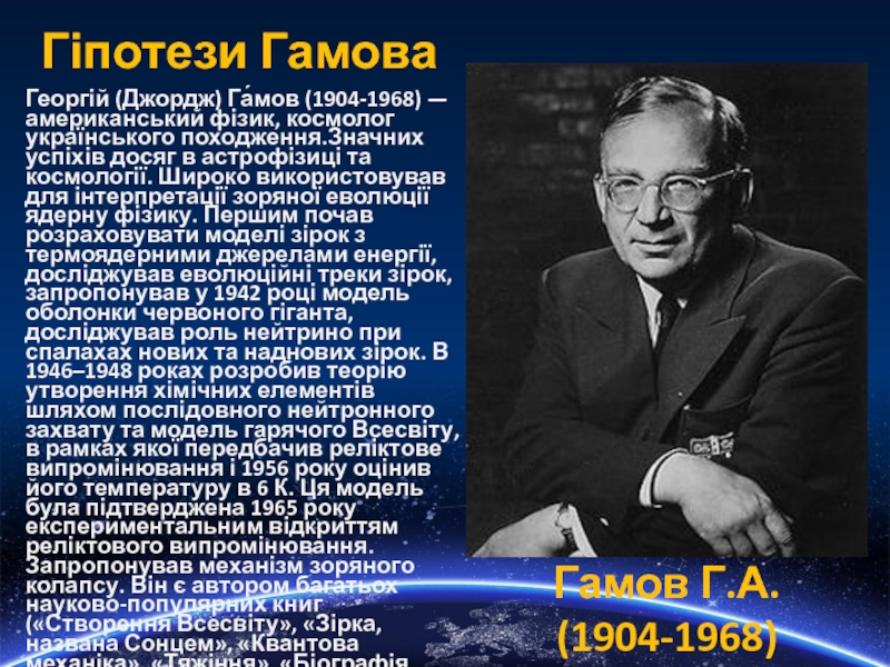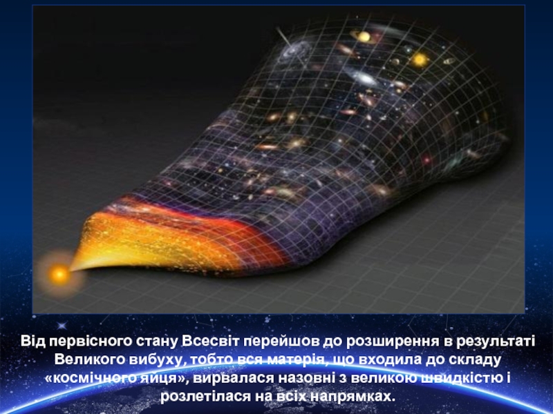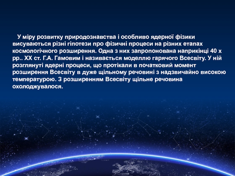 початок розвитку теорії нестаціонарного Всесвіту. Вчений досліджував нестаціонарні однорідні ізотропні моделі з простором позитивної кривини, заповненим рівномірно розподіленою матерією (з нульовим тиском). Нестаціонарність розглянутих моделей описується залежністю радіуса кривини і густини від часу, причому густина змінюється обернено пропорційно кубу радіуса кривини. Фрідман з'ясував типи поведінки таких моделей, що допускаються рівняннями тяжіння, причому модель стаціонарного Всесвіту Ейнштейна виявилася окремим випадком.Фрідман О.О.