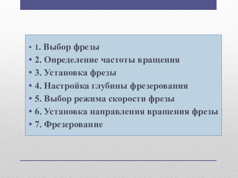 1. Выбор фрезы2. Определение частоты вращения3. Установка фрезы4. Настройка глубины фрезерования5. Выбор режима скорости фрезы6. Установка направления