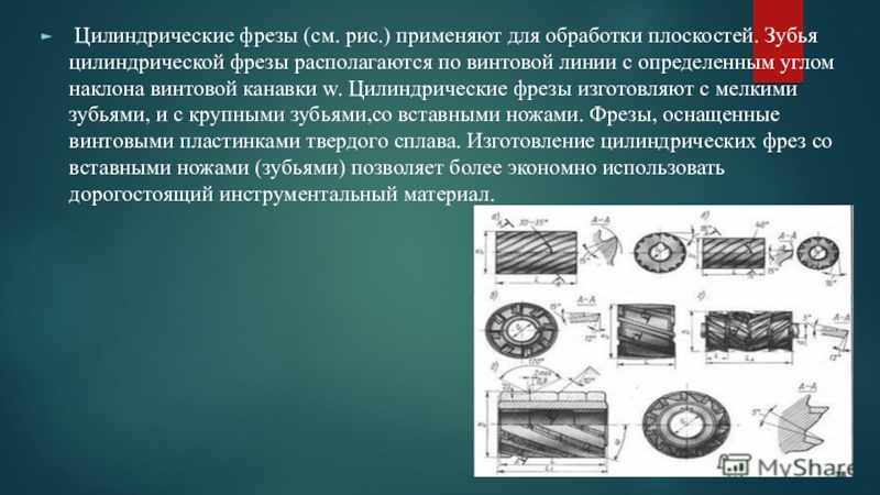 Слайд 8 Цилиндрические фрезы (см. рис.) применяют для обработки плоскостей. Зубья