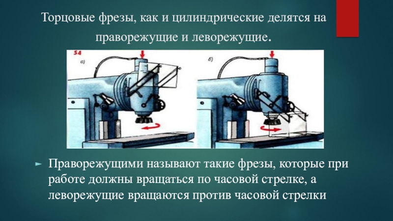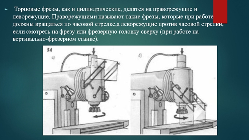 Слайд 4Торцовые фрезы, как и цилиндрические делятся на праворежущие и леворежущие.