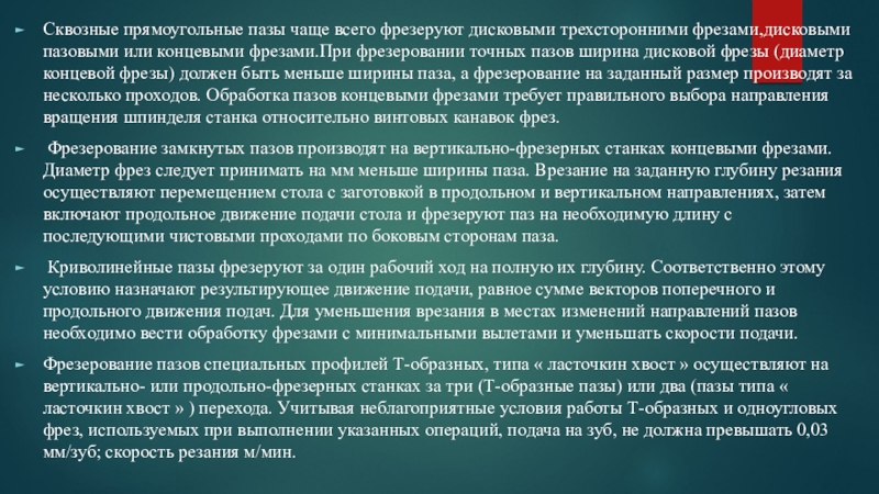 ласточкин хвост », фасонными, сквозными, открытыми, закрытыми и др. Обработка пазов является распространенной операцией на фрезерных станках различных типов и осуществляется дисковыми, концевыми и фасонными фрезами