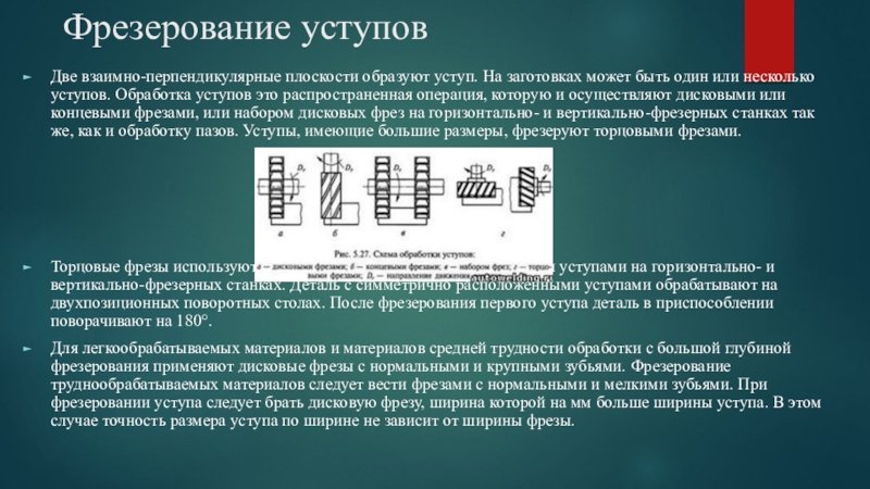 операция, которую и осуществляют дисковыми или концевыми фрезами, или набором дисковых фрез на горизонтально- и вертикально-фрезерных станках так же, как и обработку пазов. Уступы, имеющие большие размеры, фрезеруют торцовыми фрезами.