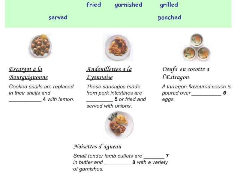 Small tender lamb cutlets are _______ 7 in butter and _________ 8 with a variety of garnishes.