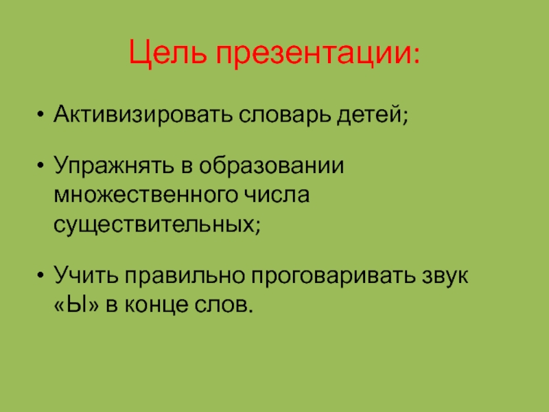Цель презентации:Активизировать словарь детей;Упражнять в образовании множественного числа существительных;Учить правильно проговаривать звук «Ы» в конце слов.