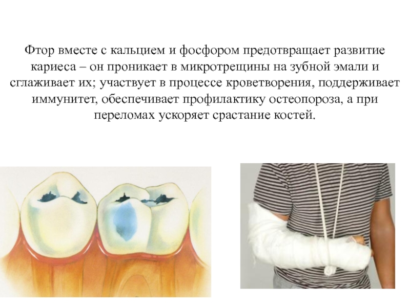 Слайд 4 Фтор вместе с кальцием и фосфором предотвращает развитие кариеса –