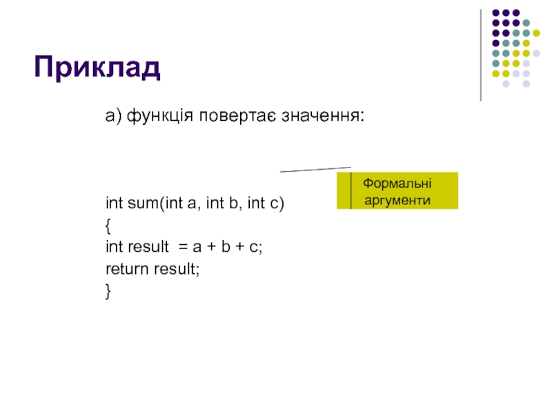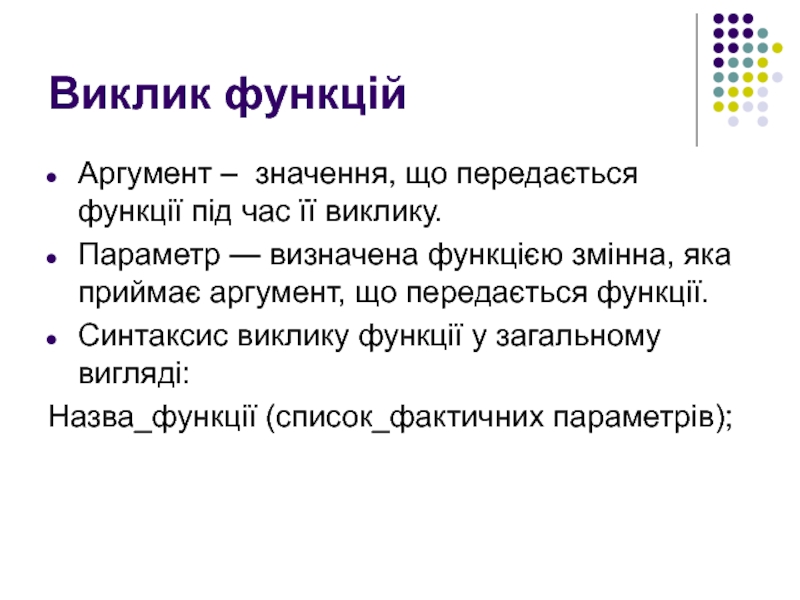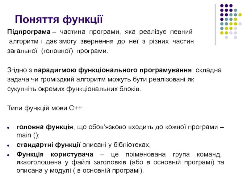Функція користувача – це поіменована група команд, якаоголошена у файлі заголовків (або в основній програмі) та описана у модулі ( в основній програмі).