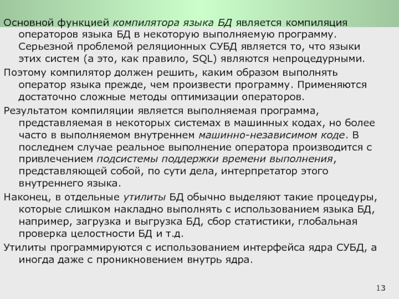 процессор языка запросов (компилятор языка БД, обычно SQL), обеспечивающий оптимизацию запросов на извлечение и изменение данных и создание машинно-независимого внутреннего кода;