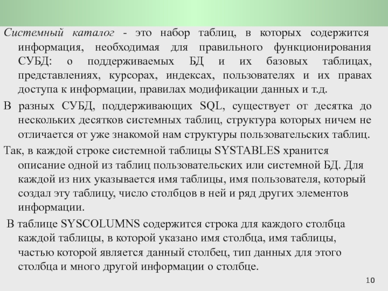 В разных СУБД, поддерживающих SQL, существует от десятка до нескольких десятков системных таблиц, структура которых ничем не отличается от уже знакомой нам структуры пользовательских таблиц.