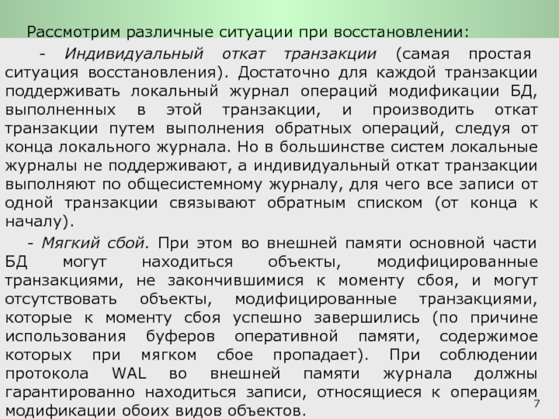 - Мягкий сбой. При этом во внешней памяти основной части БД могут находиться объекты, модифицированные транзакциями, не закончившимися к моменту сбоя, и могут отсутствовать объекты, модифицированные транзакциями, которые к моменту сбоя успешно завершились (по причине использования буферов оперативной памяти, содержимое которых при мягком сбое пропадает). При соблюдении протокола WAL во внешней памяти журнала должны гарантированно находиться записи, относящиеся к операциям модификации обоих видов объектов.