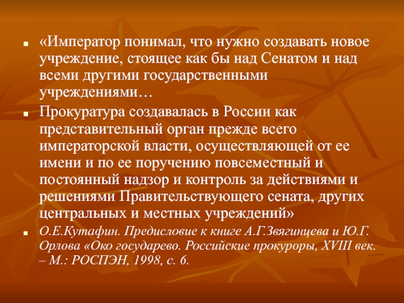 О.Е.Кутафин. Предисловие к книге А.Г.Звягинцева и Ю.Г.Орлова «Око государево. Российские прокуроры, XVIII век. – М.: РОСПЭН, 1998, с. 6.