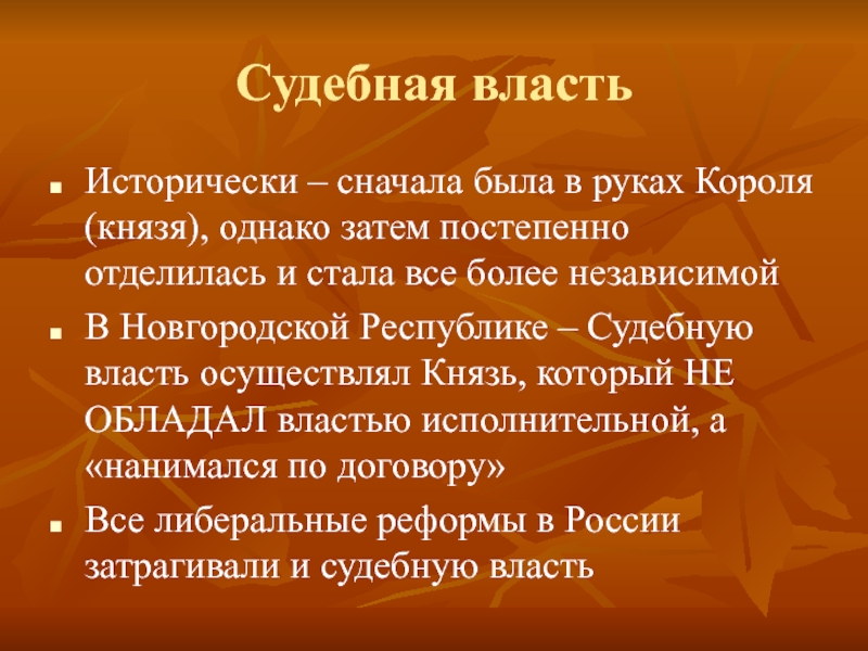– Судебную власть осуществлял Князь, который НЕ ОБЛАДАЛ властью исполнительной, а «нанимался по договору»
