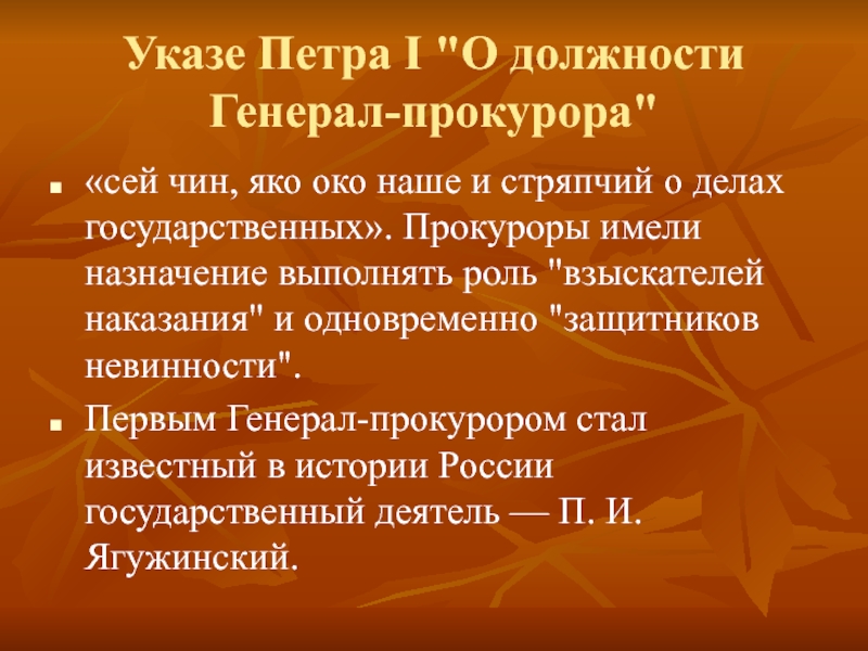 Первым Генерал-прокурором стал известный в истории России государственный деятель — П. И. Ягужинский.