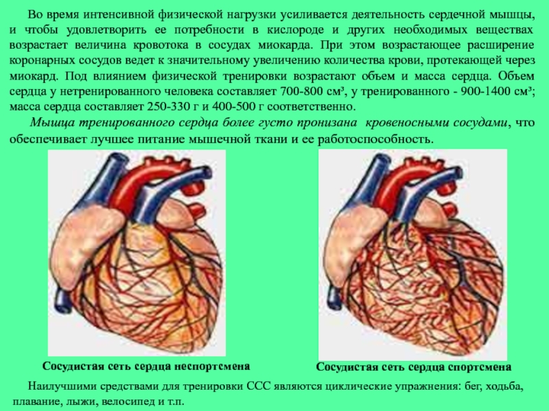 в кислороде и других необходимых веществах возрастает величина кровотока в сосудах миокарда. При этом возрастающее расширение коронарных сосудов ведет к значительному увеличению количества крови, протекающей через миокард. Под влиянием физической тренировки возрастают объем и масса сердца. Объем сердца у нетренированного человека составляет 700-800 см³, у тренированного - 900-1400 см³; масса сердца составляет 250-330 г и 400-500 г соответственно.